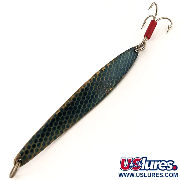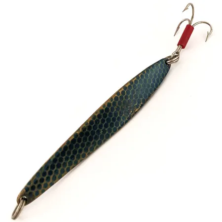 Un peso di 31 g (1 oz) fornisce la densità necessaria per raggiungere strutture profonde o tagliare il vento durante un lancio lungo. Questo Johnson Lujon, catalogato con il codice prodotto 13032, mostra un accattivante motivo a nido d'ape blu che aggiunge consistenza visiva al suo corpo da 9 cm (3 1/2"). La finitura metallica è eccezionalmente ben conservata e l'oggetto ha una valutazione di 5/5, apparendo pronto per una teca espositiva o un astuccio porta esche. Un tubicino di plastica rossa alla base dell'ancoretta funge da classico attrattore visivo e punto di attacco per i pesci. Il profilo allungato e la leggera chiglia sulla pancia sono caratteristici delle esche metalliche americane della metà del secolo destinate al jigging o al lancio. Entrambe le estremità sono dotate di robusti anellini spaccati, che garantiscono collegamenti sicuri al finale e all'hardware posteriore. Prodotto negli USA, questo esemplare riflette le tecniche di costruzione durevoli che hanno reso Johnson un nome fondamentale nell'attrezzatura da jigging verticale.