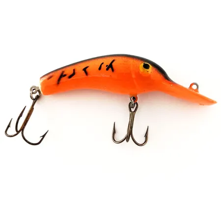 Caratterizzato da una vivace livrea Orange Tiger, questo Lindy Shadling UV vintage pesa 3/16oz (5,5g). Si tratta di un pezzo autentico della storia del fishing tackle americano degli anni '80, prodotto dall'azienda Lindy / Little Joe negli USA. Lungo 2" (5cm), il profilo del corpo imita un piccolo shad o un pesce foraggio, con un caratteristico dorso inarcato e una paletta di affondamento pronunciata. Questo esemplare, identificato dal codice prodotto 11885, è trattato con una speciale finitura UV progettata per aumentare la visibilità in acque torbide o in condizioni di scarsa illuminazione. L'armamento prevede due ancorette, una ventrale e una in coda. La verniciatura è nitida, con le striature nere da tigre che mostrano un netto contrasto con la base arancione fluorescente; lo stato generale è eccezionalmente pulito, con una valutazione di 5/5. Una sottile striscia scura corre lungo la schiena, terminando in corrispondenza degli occhi realistici.