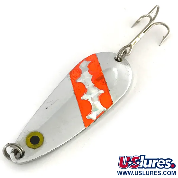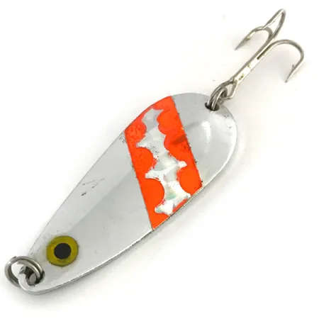 Lungo 2 1/4" (6 cm), questo ondulante Moriyama mette in mostra l'artigianato tipico dell'attrezzatura da pesca giapponese della metà del secolo. La finitura lucida Nickel / Rosso è sorprendente, caratterizzata da una larga banda diagonale rosso-arancio che incornicia un esclusivo inserto in argento zigrinato progettato per riflettere la luce. Sulla parte anteriore, un prominente occhio giallo e nero fornisce un punto focale vicino all'occhiello. Questo pezzo, identificato dal codice prodotto 8278, pesa 3/5 oz (16 g), offrendo una sensazione di consistenza adatta al lancio o alla traina. Capovolgendo l'esca si rivela il marchio del produttore "Moriyama Japan" stampato nella superficie concava in nichel. La componentistica, inclusi l'amo triplo e gli anellini spaccati, è in ottime condizioni, con un punteggio di 5/5.