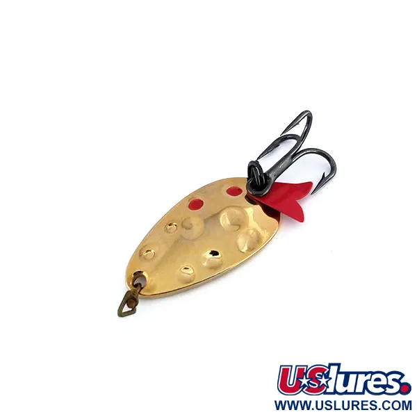 Con un peso di 5 g (3/16 oz), questo ondulante vintage presenta una classica finitura martellata sul suo corpo a forma di goccia. La superficie dorata e punzonata è caratterizzata da tre distinti punti rossi vicino alla spalla, un segno distintivo della serie Acme Fish Hawk. Contraddistinto dal codice prodotto 9923, questo raro esemplare non è più in produzione, rappresentando un pezzo storico dell'attrezzatura Made in USA. L'esca è armata con un'ancoretta dalla finitura scura e una caratteristica pinnetta trailer in plastica rossa. Lungo 3 cm (1 1/4"), il retro del cucchiaino è lucidato a specchio. Un grado di conservazione 5/5 riflette l'eccezionale stato delle superfici metalliche e della componentistica originale. Un piccolo anello spaccato triangolare in ottone sulla testa garantisce un punto di attacco robusto.
