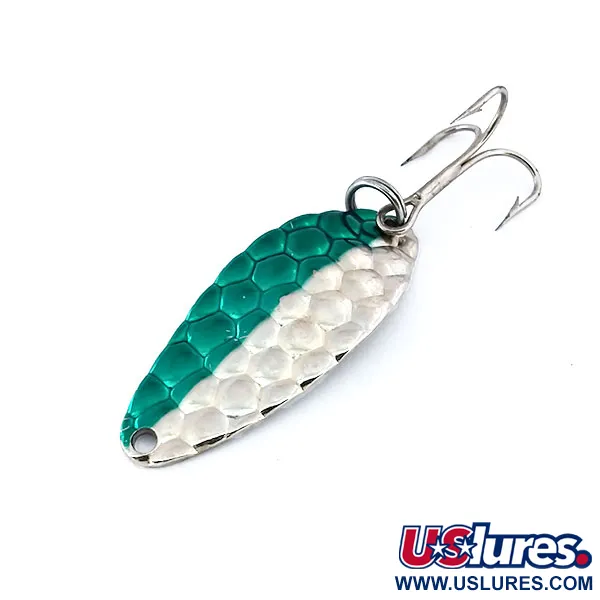 Con un peso di 7 g (1/4 oz), la caratteristica texture martellata di questo ondulante crea riflessi sfaccettati per attirare i predatori in diverse condizioni di luce. Lungo 4 cm (1 1/2"), l'Acme Little Cleo (codice prodotto: 10279) presenta una livrea Hammered Nickel / Green, con vernice verde vibrante su metà della faccia e base in nichel lucido sull'altra metà. La sua esclusiva forma a gobba è un segno distintivo della produzione americana Acme, progettata specificamente per lanci a lunga distanza e traina. La componentistica include un robusto anello spaccato collegato a un'ancoretta affilata con finitura argentata. Valutata 5/5, l'esca è eccezionalmente ben conservata, con una brillantezza intatta sia sulla parte frontale martellata che sul retro liscio.