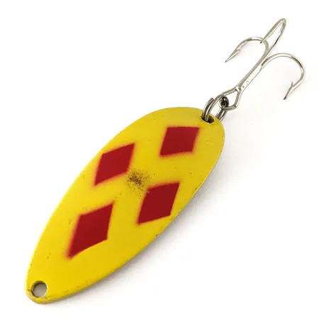 Cinque rombi rossi su uno sfondo giallo vibrante definiscono l'iconica finitura di questo cucchiaino ondulante da 11 g (2/5 oz). Chiaramente stampato sul retro in metallo con il nome "LITTLE CLEO ®" e il peso, questo artificiale Acme rimane un eccellente esempio di attrezzatura prodotta negli USA. Lungo 5,5 cm (2 1/4"), il profilo a gobba dell'ondulante è bilanciato sia per il lancio che per la traina. La componentistica originale è intatta, con un'ancoretta argentata montata su un robusto anello spaccato. Per un collezionista, la valutazione 5/5 è evidente nella finitura lucida, sebbene sia visibile un piccolo segno del tempo vicino al motivo centrale. Identificato dal codice prodotto 12330, questo esemplare rappresenta una combinazione cromatica classica, ideale per la pesca al luccio e alle grandi trote. La superficie posteriore mantiene un aspetto lucido e levigato che garantisce un notevole flash sott'acqua.