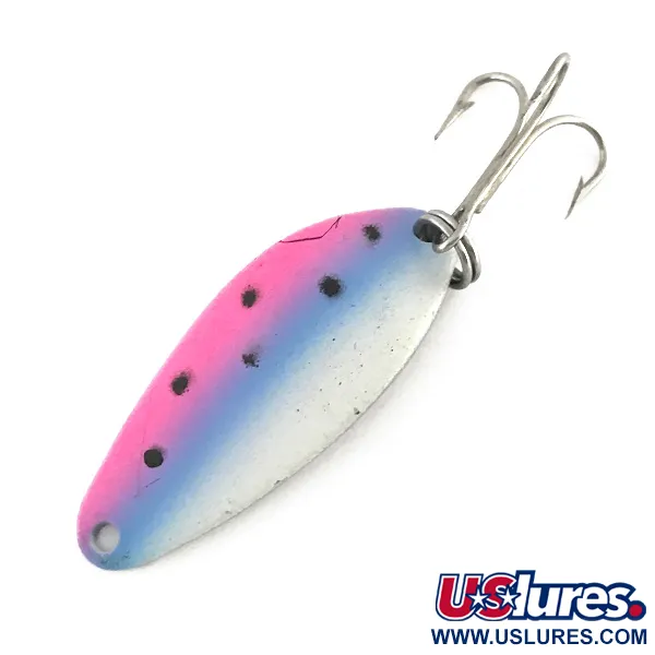 Il peso di 1/4oz (7g) è chiaramente stampato sul nichel lucidato del retro, insieme al logo del marchio. Sul fronte, la colorazione Trout garantisce un'alta visibilità grazie a tre bande verticali rosa, blu e bianche, rifinite con sei punti neri. Con una lunghezza esatta di 1 1/2" (4cm), il corpo in metallo pesante è progettato per il lancio o la traina di vari pesci predatori. La dotazione comprende un robusto anellino spaccato e un'ancora affilata, entrambi privi di segni del tempo. Catalogato con il codice 8289, questo Acme Little Cleo è un classico esempio di attrezzatura prodotta negli USA. L'esemplare è valutato 5/5 per le condizioni, poiché la vernice è intatta e il retro nichelato mantiene la sua finitura a specchio.