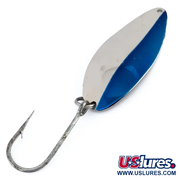 Con un peso sostanziale di 35 g (1 1/4 oz), questo Acme Little Cleo è un classico cucchiaino ondulante americano costruito per raggiungere grandi distanze di lancio. Lungo 8 cm (3 1/4"), il lato frontale dell'esca presenta un caratteristico design bicolore con una vivace striscia blu che contrasta con la base in nichel lucidato. Sul retro, la superficie pulita in nichel reca chiaramente stampato il nome "LITTLE CLEO", a testimonianza della sua produzione negli Stati Uniti. Questo esemplare, registrato con il codice prodotto 9940, è armato con un robusto amo singolo fissato da un anello spaccato ad alta resistenza. Le condizioni sono valutate 5/5, con una finitura a specchio e una verniciatura nitida su tutto il corpo in metallo.