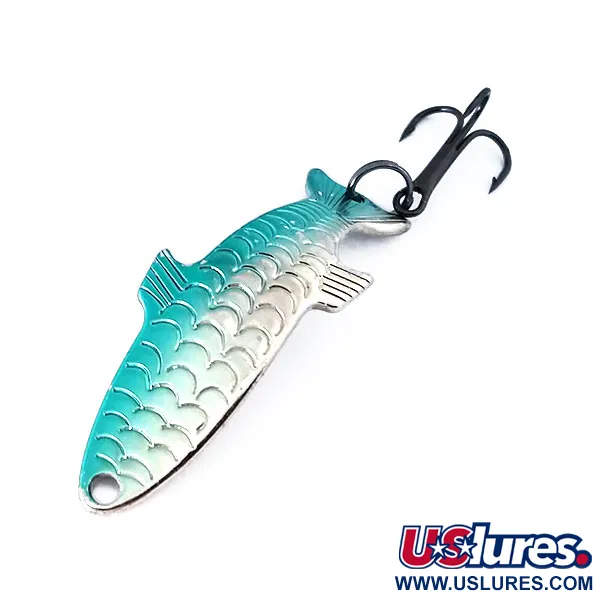 Con un peso esatto di 4 g (1/8 oz), questo ondulante mette in mostra una livrea a scaglie dettagliata con una sfumatura che passa da un intenso blu-verde lungo il dorso a una finitura nickel brillante. Questo Acme Phoebe di produzione americana, identificato dal codice prodotto 10352, misura 4 cm (1 1/2") e presenta una distinta silhouette a forma di pesce con opercoli branchiali e pinne stampati per esaltarne il profilo tridimensionale. Il lato posteriore è in nickel lucido e riporta chiaramente i marchi Acme e Phoebe stampati. Dotato di ancorette originali con finitura scura e di un robusto anellino spaccato, la minuteria è in eccellenti condizioni. Con una valutazione di stato pari a 6, l'esca è inutilizzata e mostra la stessa lucentezza di quando è uscita dalla fabbrica. La sua specifica forma idrodinamica è progettata per la versatilità, consentendo di pescare efficacemente a varie profondità nella colonna d'acqua.