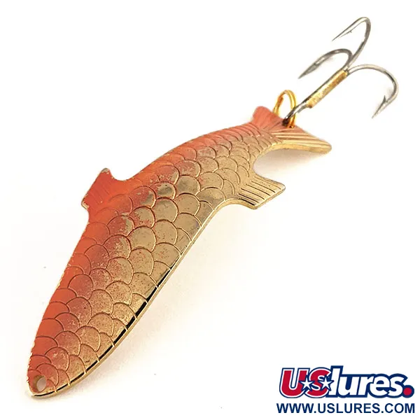 Una sorprendente sfumatura Oro / Arancio definisce la finitura di questo ondulante da 14 g (1/2 oz), passando da una calda tonalità tramonto sulla testa a un ottone lucido e brillante. Lungo 7 cm (2 3/4"), il corpo presenta un motivo a squame in rilievo dettagliato che cattura la luce, imitando la trama di un vero pesce esca. Sul lato posteriore liscio è chiaramente stampato il nome PHOEBE, marchio dell'artigianato americano di Acme dalla loro produzione con sede negli USA. Questo specifico esemplare, catalogato con il codice 12250, mantiene eccezionalmente bene la sua lucentezza, mostrando solo minimi segni di manipolazione che riflettono la sua valutazione di condizione 5/5. Il profilo curvo a forma di pesce è abbinato a un robusto anello spaccato dorato e a un'ancoretta affilata, adatta a una varietà di tecniche di lancio e jigging. L'accento arancione sulla cresta dorsale fornisce un sottile contrasto visivo rispetto alla placcatura in oro ad alta visibilità.