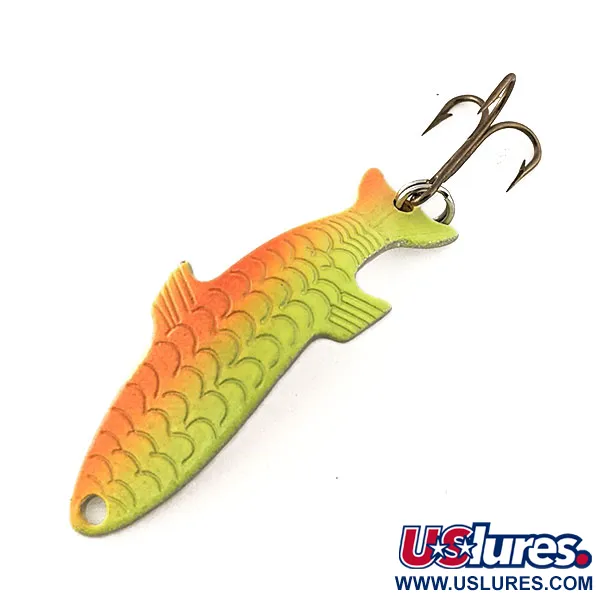 Progettato con un profilo curvo unico e scaglie stampate, questo cucchiaino imita i dettagli anatomici di un piccolo pesce esca. Con un peso di 4 g (1/8 oz) e una lunghezza totale di 4 cm (1 1/2"), l'Acme Phoebe UV (codice prodotto 11487) è ingegnerizzato con proprietà idrodinamiche che creano un'illusione tridimensionale. La finitura sfumata Giallo / Arancio è trattata con pigmenti fluorescenti, consentendo all'esca di brillare intensamente sotto la luce UV per una maggiore visibilità in acque scure o torbide. Come esemplare nuovo, conserva la vernice originale di fabbrica e i dettagli di stampaggio nitidi. Il corpo curvo è costruito per la versatilità a diverse profondità e velocità di recupero. Un'ancoretta con finitura bronzo è fissata nella parte posteriore, completando questo classico design Acme.