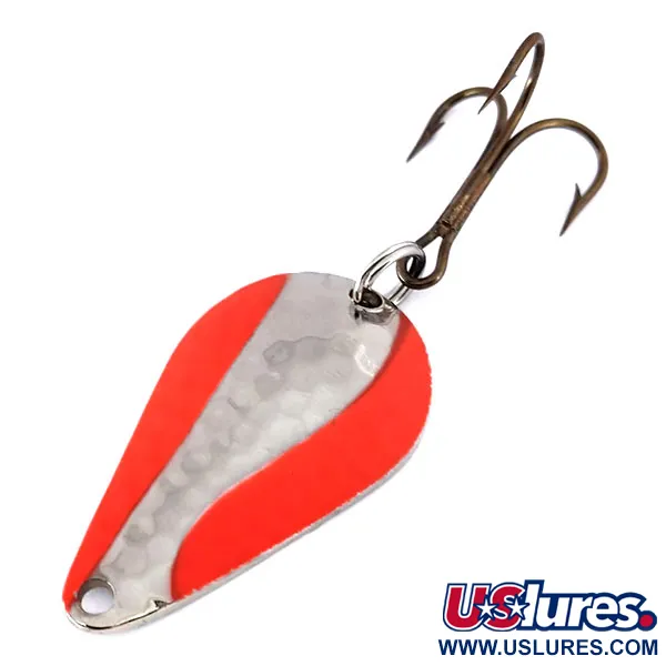 Un corpo nichelato abbinato a strisce arancioni fluorescenti definisce il profilo visivo di questo Acme Stee-Lee UV da 4,5 cm (1 3/4"). Con un peso di 14 g (1/2 oz), l'ondulante presenta una sottile texture martellata sulla superficie metallica, che interagisce con il pigmento ad alta visibilità. Sotto la luce ultravioletta, le bande arancioni passano a un bagliore rosso-arancio luminoso, una caratteristica tecnica utilizzata per la visibilità in acque profonde o in condizioni di scarsa illuminazione. Questo esemplare, contrassegnato dal codice prodotto 10371, è inutilizzato con una valutazione dello stato pari a 6. L'hardware comprende un amo tripletta bronzato fissato tramite un anello spaccato, riflettendo gli standard di costruzione pesante del produttore. Un foro per la lenza è punzonato in modo pulito all'estremità stretta della paletta a forma di goccia per ospitare varie configurazioni di nodi o moschettoni.