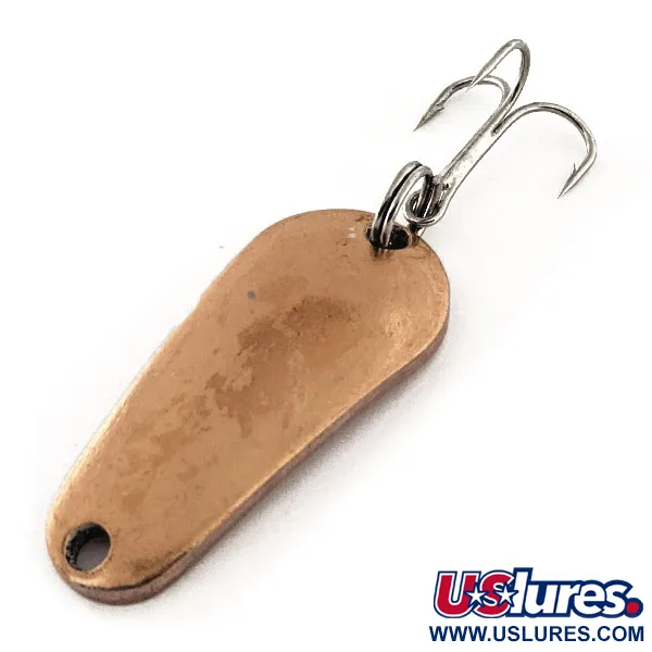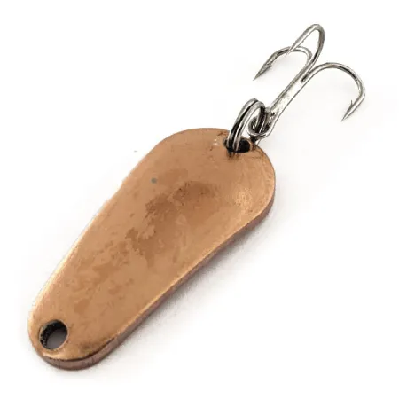 Una calda finitura in rame definisce questo classico ondulante americano, che riflette la luce con quel bagliore tenue tipico delle esche metalliche vintage. Prodotto dalla ditta Aeroplane Spinner negli USA, questo modello Aero (Codice prodotto: 11796) rappresenta un periodo di design essenziale ed efficace. Con un peso di 7 g (1/4 oz) e una lunghezza di 3,7 cm (1 1/2"), il suo profilo a goccia è stampato con una curvatura sottile per interagire con la resistenza dell'acqua. L'esemplare non è mai stato usato ed è in condizioni 5/5, mostrando una superficie pulita e priva di usura. È dotato di un anellino spaccato argentato e di un'ancoretta affilata, che contrastano piacevolmente con il tono ricco e oro-rossastro del corpo in rame.