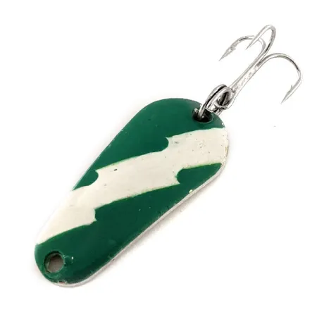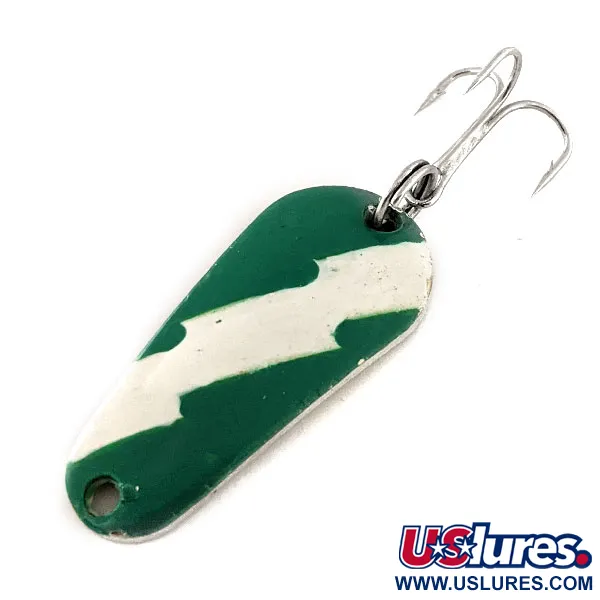 Sulla parte posteriore dorata e lucida sono impressi chiaramente il nome Aero e il peso, che identificano questo classico ondulante di produzione americana della ditta Aeroplane Spinner. Con una lunghezza di 3,7 cm (1 1/2"), l'esca presenta una sorprendente finitura smaltata sul lato convesso, dove una striscia bianca frastagliata divide un campo verde scuro. Questo specifico esemplare, identificato dal codice 11803, è in eccellenti condizioni 5/5 con la vernice originale nitida e vibrante. Un'ancoretta argentata affilata è fissata alla parte posteriore tramite un robusto anellino spaccato, pronta per il lancio o la traina leggera. Il peso di 7 g (1/4 oz) fornisce massa sufficiente per un posizionamento mirato in varie condizioni d'acqua. Il metallo color ottone sul retro funge da flash ad alto contrasto rispetto al lato superiore verniciato.
