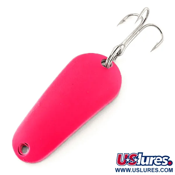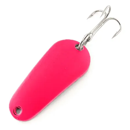 Con una lunghezza compatta di 3,7 cm (1 1/2"), il corpo a forma di goccia di questo cucchiaino Aero presenta una finitura rosa fluorescente ad alta visibilità. Sotto la luce ultravioletta, il rivestimento UV-reattivo emette un bagliore rosso profondo, pensato per la visibilità in condizioni di scarsa illuminazione. Un'ancoretta affilata è fissata tramite un anello spaccato all'estremità più larga del metallo stampato, mentre un foro di aggancio pulito si trova sulla punta affusolata. Questo esemplare, identificato dal codice prodotto 12051, proviene dagli USA e mantiene una condizione 5/5 con una superficie vibrante e uniforme. Con un peso di 7 g (1/4 oz), l'esca è costruita per diverse tecniche di lancio e vertical jigging. La Aeroplane Spinner company ha utilizzato questa specifica vernice fluorescente per esaltare il profilo delle sue esche classiche della serie 'Aero'.
