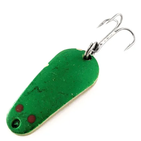 Con una lunghezza di esattamente 1 1/2" (3,7 cm), questo cucchiaino compatto di Aeroplane Spinner presenta una finitura verde vibrante sulla faccia anteriore, punteggiata da due distinti punti rossi vicino all'occhiello. Con un peso di 1/4 oz (7 g), il peso è concentrato per lanci precisi in varie condizioni d'acqua. Il lato posteriore rivela una pulita finitura dorata, offrendo un classico contrasto con la tonalità verde primaria. Sotto la luce ultravioletta, il rivestimento «Aero UV» (codice prodotto 11792) dimostra la sua natura specializzata brillando intensamente, un vantaggio tattico per acque più profonde o torbide. La componentistica è composta da un unico amo tripletta affilato fissato da un anellino spaccato, mostrando il design orientato alla praticità tipico delle attrezzature prodotte negli Stati Uniti. Questo esemplare particolare è in condizioni eccezionali 5/5, mantenendo la sua lucentezza originale sia sulle superfici verniciate che su quelle metalliche.