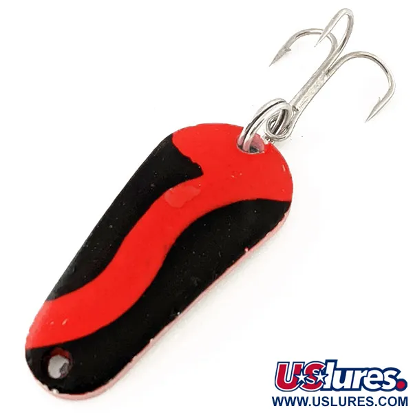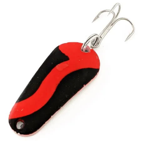 Caratterizzato da un audace motivo a onde nere e rosse su base dorata, questo modello esibisce la classica estetica Aeroplane Spinner. Prodotto negli USA, l'Aero UV presenta uno speciale rivestimento fluorescente che reagisce intensamente alla luce ultravioletta. Con un peso versatile di 7 g (1/4 oz) e una lunghezza di 3,7 cm (1 1/2"), rappresenta un profilo da lancio standard per diverse specie d'acqua dolce. L'amo triplo è fissato saldamente tramite un robusto anellino spaccato, assicurando una tenuta impeccabile. Questo esemplare, catalogato con il codice 12055, mantiene una valutazione di 5/5, con finiture pulite e colori vivaci. Il contrasto tra il nero profondo e la striscia rosso-arancio fluorescente fornisce una firma visiva distinta per gli ambienti con scarsa illuminazione.