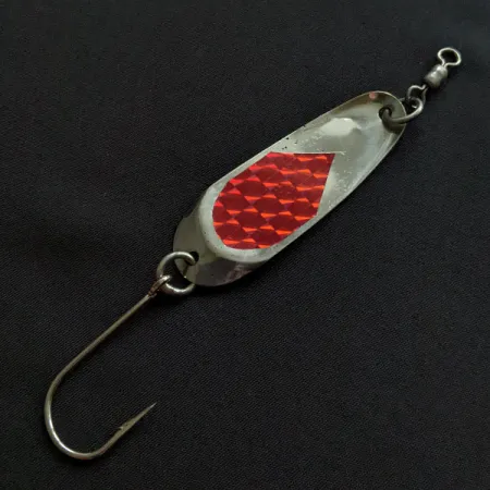 L'adesivo prismatico rosso funge da punto focale ad alto contrasto sul corpo nichelato di questo classico da 7g (1/4oz). Con una lunghezza esatta di 6 cm (2 1/4"), l'ondulante Andy Reekers rappresenta l'epoca d'oro della produzione di attrezzatura da pesca della West Coast negli USA. La componentistica include un grande amo singolo fissato tramite un robusto split ring e una girella barrel già montata per gestire le torsioni della lenza. Identificato dal codice prodotto 20373, l'artificiale conserva un aspetto pulito con una valutazione di 4/5, mostrando solo lievi segni del suo passato vintage. Il profilo allungato e sottile è tipico dei cucchiaini ondulanti progettati per un impiego versatile, sia nel lancio che nella traina.