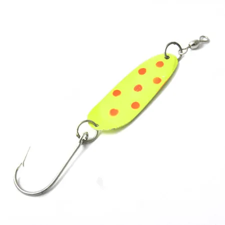 Punteggiata da cerchi rossi su uno sfondo giallo vibrante, l'Andy Reekers 3 riflette lo stile visivo distintivo dell'attrezzatura da traina statunitense della metà del secolo. Questo esemplare da 4,5 g (3/16 oz), identificato dal codice prodotto 0440, presenta un profilo semplice ma efficace, progettato per un movimento costante nella colonna d'acqua. Il lato posteriore è rifinito in giallo pieno con un occhio a bersaglio nero e giallo vicino alla punta, che fornisce un punto focale secondario per i pesci che inseguono. È dotata di un amo singolo e di una girella montata anteriormente, essenziali per mantenere la stabilità ed evitare la torsione del filo durante la traina. L'esemplare è in condizioni 5/5, mantenendo la finitura originale di fabbrica sia sul corpo che sulla minuteria.