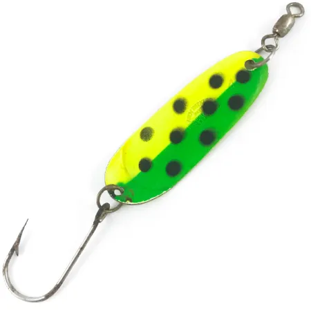 Con una lunghezza esatta di 6 cm, questo classico ondulante da traina presenta una finitura audace e ad alto contrasto, progettata per la massima visibilità. Questo modello Andy Reekers UV, dal peso di 7 g, sfoggia una distintiva parte anteriore divisa verticalmente tra giallo brillante e verde vibrante, punteggiata da una serie di grandi punti neri. Il retro dell'esca è rifinito con un rivestimento giallo a tinta unita reattivo agli UV, una scelta tecnica destinata alla traina in acque profonde dove la penetrazione della luce è limitata. Già pronto all'uso, include un grande amo singolo e una girella barrel montata in testa, collegati da robusti anelli spaccati. Prodotto negli USA con il codice prodotto 4691, la base in nichel fornisce una base durevole per la verniciatura. Questo esemplare è in condizioni eccellenti (5/5), mostrando una superficie ben conservata tipica di un reperto vintage di alta qualità. La vernice rimane vibrante sul corpo in metallo stampato, segno distintivo del design Reekers per i pescatori di salmoni e trote.