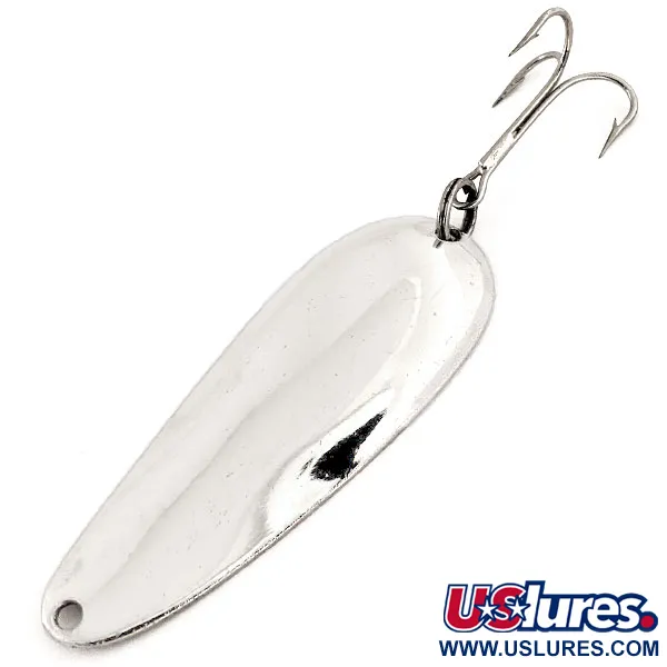 Con un peso di esattamente 1/2 oz (14 g), questo classico pezzo di storia dell'attrezzatura americana presenta una finitura Nickel brillante che rimane straordinariamente nitida. Il corpo a forma di goccia misura 2 3/4" (7 cm) e monta la componentistica originale di fabbrica, inclusi un robusto anello spaccato e un'affilata ancoretta all'estremità posteriore. Sul lato concavo, l'Aqua Spoon è chiaramente punzonata con il suo nome e la dicitura "MADE IN U.S.A.", un dettaglio spesso ricercato dai collezionisti della produzione Nebco di metà secolo. Questo esemplare, contrassegnato dal codice prodotto 12969, è in condizioni 5/5, con una superficie altamente riflettente e bordi puliti. Il design semplice e funzionale di questo ondulante evidenzia i rigorosi standard produttivi dell'epoca.