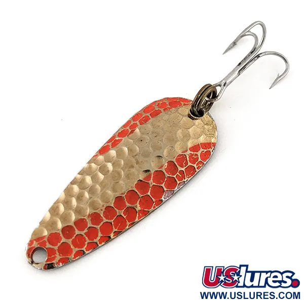 Texture in oro martellato definiscono la superficie di questo Nebco Aqua Spoon vintage da 1/4 oz (7 g), catturando la luce attraverso il suo classico profilo martellato. Con una lunghezza di 2" (5 cm), la faccia è impreziosita da un vivace motivo a scaglie rosso-arancio che rimane incredibilmente nitido per un'esca della sua epoca. Sul retro dorato liscio sono impressi chiaramente i marchi "AQUA SPOON" e "MINNEAPOLIS", segno distintivo della sua produzione statunitense di metà secolo. Questo esemplare, registrato con il codice 13078, vanta una valutazione di 5/5, non mostrando perdite significative di finitura o componentistica. L'anellino spaccato originale in ottone è fissato saldamente a un'ancoretta con finitura argentata, riflettendo la solidità su cui i pescatori facevano affidamento per lo spinning in acqua dolce. La sua forma a goccia è rifinita con un foro per il nodo praticato con precisione all'estremità più stretta per garantire un corretto assetto durante il recupero.