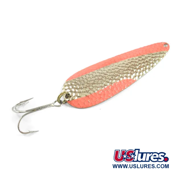 Finiture in oro martellato e arancione vibrante creano un contrasto visivo sorprendente sulla faccia di questo artificiale, catalogato con il codice 2452. Con un peso di 21 g (3/4 oz) e una lunghezza di 9 cm (3 1/2"), l'ondulante presenta una texture profondamente martellata progettata per catturare e riflettere la luce su tutta la superficie. Il lato posteriore rivela una finitura dorata liscia e lucida, chiaramente stampata con la dicitura "AQUA SPOON MADE IN USA", evidenziando la sua eredità Nebco. Questo esemplare è in condizioni 5/5, mostrando una lucentezza metallica pulita e una vernice ben conservata sui bordi esterni. Un'ancoretta ultra resistente è fissata saldamente tramite un robusto anello spaccato in ottone in coda, mentre la punta è pre-forata per l'attacco diretto del filo. Progettato per lo spinning tradizionale o la traina, la forma a goccia e il peso consistente dell'ondulante forniscono la densità necessaria per lunghi lanci e per gestire la profondità in acque aperte.