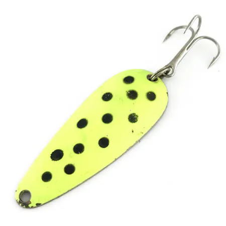 Sulla parte posteriore in bronzo di questo ondulante in metallo da 9 g (1/3 oz) sono chiaramente stampati i classici marchi Blue Fox e l'origine "USA". Lungo 5,5 cm (2 1/4"), questo Aqua Spoon riporta il codice prodotto 9525 e presenta una faccia anteriore chartreuse ad alta visibilità punteggiata da tredici puntini neri. L'esemplare è in condizioni 4/5, con lievi segni d'uso dovuti a una piccola perdita di finitura ai bordi della vernice, sebbene il metallo sottostante e le scritte stampate rimangano nitidi. La sua struttura include una robusta ancoretta fissata da un anellino spaccato, rendendolo una scelta affidabile per il lancio o la traina in varie condizioni di luce. Il contrasto tra la superficie verniciata neon e il lato inferiore in ottone metallico è un design distintivo dell'era della produzione americana del marchio. Un piccolo logo a testa di volpe è inciso vicino al foro di attacco, aggiungendo un tocco finale di autenticità per il collezionista di attrezzatura vintage.
