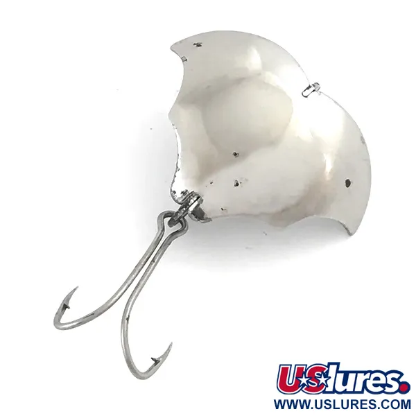Punzonata con la scritta "Baby" e una "B" stilizzata sul lato inferiore delle ali, questa esca metallica di Harrison Industries della metà del secolo scorso è un capolavoro di design eccentrico. Il corpo da 3,5 cm (1 1/2") presenta una brillante finitura al nichel, meticolosamente modellata in una silhouette a pipistrello con una prominente pinna stabilizzatrice verticale lungo il dorso centrale. Con un peso di 14 g (1/2 oz), questo esemplare prodotto negli USA, codice prodotto 5282, offre una densità significativa per le sue dimensioni compatte. Si presenta in condizioni 4/5, con una superficie lucida e pulita che mette in risalto i dettagli originali di fabbricazione e le incisioni nette. L'armatura consiste in un robusto amo doppio a gambo aperto fissato tramite un anello spaccato all'estremità della coda.