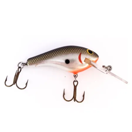 Realizzata in pregiato legno di balsa, questa esca classica pesa esattamente 12 g (2/5 oz). Il suo corpo da 6 cm (2 1/4") sfoggia una livrea shad meticolosamente applicata, evidenziata da un motivo a scaglie a nido d'ape scuro sul dorso e fianchi argentati scintillanti. Gli accenti visivi includono una netta macchia nera laterale, una sfumatura branchiale rossa curva e una sezione della gola arancione brillante. I grandi occhi gialli con pupille nere forniscono un punto focale ad alto contrasto caratteristico dell'artigianato americano di Bagley. Una grande paletta trasparente è integrata nel muso, dotata di un anello a spaccatura di fabbrica per un montaggio sicuro. La dotazione comprende due affilate ancorette color bronzo. Mantenendo un alto livello di conservazione, questo esemplare è valutato 5/5 per il suo aspetto pulito e lucente. Questo particolare Bagley B2 è identificato dal codice prodotto 10027.