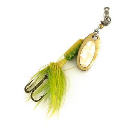 Le tonalità dell'oro e del verde dominano la tavolozza di questo Luhr Jensen Bang Tail 0, un cucchiaino rotante compatto dal peso di 3,5 g (1/8 oz). Sulla pala dorata, il nome "BANG TAIL" e la taglia "0" sono stampigliati insieme a un inserto riflettente testurizzato che fornisce un significativo contrasto visivo. Il corpo zavorrato presenta una vivace trama a nido d'ape verde su base gialla, che termina in un'ancoretta piumata vestita di un piumaggio chartreuse e giallo brillante. Lungo esattamente 5 cm (2"), questo artificiale prodotto negli USA è catalogato con il codice prodotto 7892. La componentistica è notevolmente pulita, inclusa la girella a barilotto integrata e le punte affilate dell'ancoretta. Questo esemplare riceve una valutazione di 5/5, poiché le piume sono flessibili e la finitura dorata rimane brillante e priva di macchie su tutta la struttura.