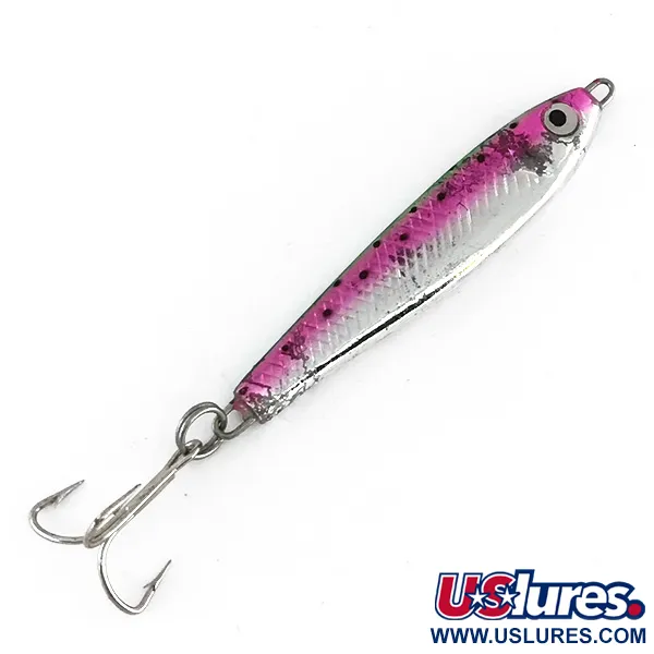 Con un peso di 17 g (3/5 oz), questo metal jig offre la densità necessaria per lanci di precisione o vertical jigging in acque profonde. Bass Pro Shops ha prodotto questo specifico esemplare, catalogato con il codice 8244, della lunghezza di 6 cm (2 1/4"). La colorazione Trout è particolarmente accattivante, combinando un fianco rosa acceso con una base cromata argento e sottili riflessi verdi lungo il dorso. Piccoli puntini neri sono sparsi sulla sezione rosa per imitare la livrea delle prede naturali. Un classico amo triplo argentato è fissato in coda con un robusto anellino spaccato, garantendo ferrate sicure. Questa esca è in condizioni 5/5, con una superficie riflettente impeccabile e nessuna ossidazione visibile sulle parti metalliche. Il profilo stretto e idrodinamico è caratteristico dei jig nordamericani del tardo XX secolo, ottimizzato per ridurre la resistenza all'acqua durante la discesa.