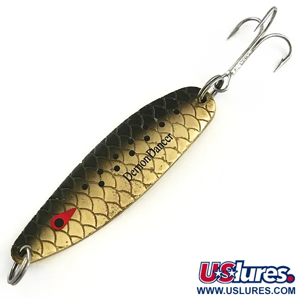 Un peso di 1/2oz (14g) fornisce la densità necessaria per lanci a lunga distanza e per raggiungere le strutture in acque profonde. Decorato con una finitura Trota Fario, il corpo metallico sfuma da un marrone-oliva scuro lungo il dorso a una base oro-ottone lucida, accentuata da una serie di punti neri e un motivo di scaglie realistico. La tradizione del produttore è visibile sul lato concavo, dove il logo Bass Pro Shops è chiaramente stampato insieme all'indicazione del peso. Identificato con il codice 6627, questo ondulante misura 2 1/2" (6,5 cm) e mantiene una presentazione eccezionale, con una valutazione delle condizioni di 5/5. Un occhio a goccia rosso stilizzato vicino alla punta fornisce un netto contrasto visivo rispetto alla finitura dorata metallica. Anelli spaccati ad alta resistenza assicurano la componentistica, incluso un classico amo triplo con finitura argentata che rimane brillante. Il nome Demon Dancer è stampato in grassetto sul lato convesso, identificando questa esca come un classico dell'attrezzatura prodotta negli Stati Uniti.