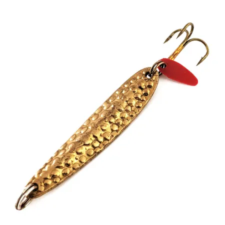 La placcatura in bronzo martellato (ottone) crea la distintiva texture a fossette su questo artificiale da vertical jigging di 4,5 cm. Con un peso di 6 g, questo esemplare, identificato dal codice prodotto 11438, mantiene il classico profilo sottile che Bay de Noc ha perfezionato per insidiare i pesci predatori in varie condizioni d'acqua. Una paletta in plastica rosso vivace pende dall'anello spaccato posteriore, fornendo un netto contrasto visivo contro il corpo metallico e fungendo da punto focale per scatenare l'attacco. La struttura include robusti anelli spaccati ad entrambe le estremità, assicurando che l'ancoretta originale sia fissata saldamente per il jigging verticale o il lancio. Nelle sue condizioni 5/5, il metallo rimane lucido e la componentistica è ben conservata. I design tradizionali delle esche scandinave hanno fornito il modello per questo artificiale, che Bay de Noc produce negli USA da oltre 50 anni per aiutare i pescatori a catturare persici, sandri e trote.