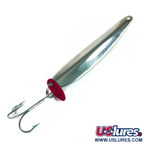 Un peso di 1 oz (28 g) rende questo jig verticale una scelta formidabile per raggiungere rapidamente la profondità in correnti sostenute o bacini lacustri profondi. Contrassegnato dal codice prodotto 1727, questo Bay de Noc Swedish Pimple presenta una finitura Nichel / Bianco / Rosso, dove il corpo in nichel lucido è completato da un inserto in nastro riflettente bianco. Questo specifico esemplare misura 3 1/4" (8 cm) ed è in condizioni eccellenti 5/5, con una superficie riflettente perfetta e un'ancoretta sicura. All'anellino spaccato inferiore è collegata la caratteristica paletta attrattrice in plastica rossa, un segno distintivo del design Swedish Pimple utilizzata per creare un punto focale per l'attacco del predatore. Un occhio sfaccettato color magenta è incastonato vicino alla coda, fornendo un ulteriore punto di contrasto visivo. Questa esca è un pilastro della storia delle attrezzature da pesca americane, progettata specificamente per il vertical jigging sotto il ghiaccio o in acque libere.