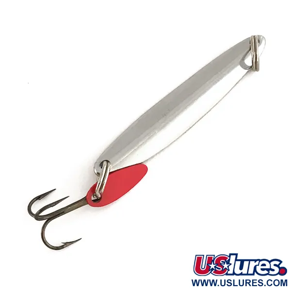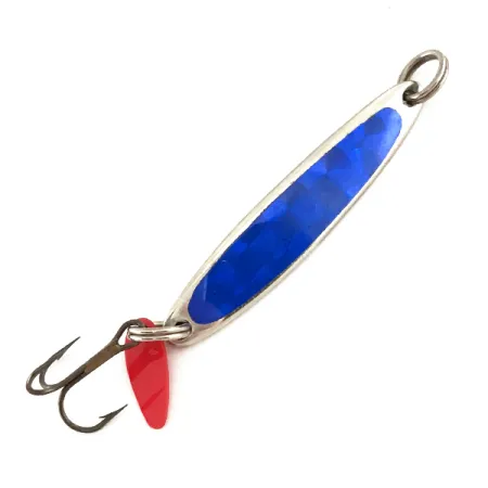 Lungo 4,5 cm (1 3/4"), questo pilker fondamentale per il jigging verticale di Bay de Noc presenta un inserto prismatico blu su una finitura in nichel lucidato. Con un peso di 5,5 g (3/16 oz), l'esca — codice prodotto 7442 — è un esempio tipico dell'artigianato di Gladstone, Michigan, che ha segnato la pesca nel ghiaccio per generazioni. Il design punta su un corpo sottile e zavorrato che agevola la pesca in profondità, abbinato all'iconica paletta flicker rossa in plastica fissata all'anello brisè inferiore. Questa pinna attrattrice funge da bersaglio visivo proprio in corrispondenza dell'ancora in bronzo. Attualmente, l'esca mantiene condizioni eccellenti (valutazione 5/5), con superfici riflettenti pulite e componenti robusti. I grandi anelli brisè su entrambe le estremità consentono un attacco sicuro del filo e una mobilità ottimale dell'amo per le tecniche di jigging verticale o lancio.