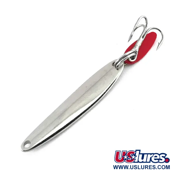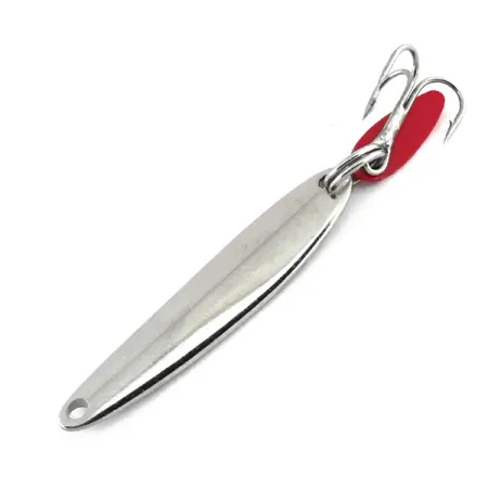 Una classica finitura al nichel riveste questo cucchiaino da vertical jigging da 3,5 cm (1 1/2"), fornendo l'alta visibilità necessaria per le presentazioni in acque profonde. Bay de Noc produce questi artificiali nel Michigan da decenni e questo specifico esemplare da 4,5 g (3/16 oz), identificato dal codice prodotto 8730, mostra la solida costruzione sinonimo del marchio. Si noti la vivace aletta flicker in plastica rossa attaccata vicino all'ancoretta; funge da punto di attrazione visiva per i pesci in acque più scure. La componentistica, inclusi gli anellini spaccati e l'ancoretta, è in condizioni pulite e ben conservate, meritando una valutazione di 5/5. Progettato principalmente per il jigging verticale, il profilo a goccia dell'esca permette di raggiungere rapidamente la profondità desiderata sia in acque libere che durante la pesca nel ghiaccio. Un unico foro di attacco pulito si trova nel punto più stretto del cucchiaino per un montaggio diretto.