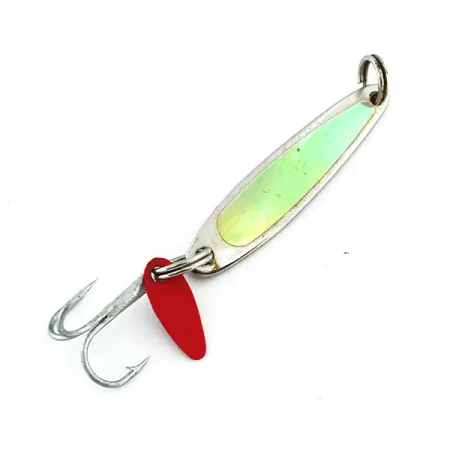 Un peso agile di 3/16 oz (5 g) definisce questa esca per il jigging verticale, rendendola una scelta versatile per presentazioni finesse. Il corpo in nichel è impreziosito da un inserto in nastro olografico che riflette un rosa con sfumature verdi, cambiando colore quando la luce colpisce la superficie metallica. Per garantire un punto d'attacco per il pesce, una piccola paletta in plastica rossa è montata sull'anello spaccato insieme all'ancoretta. Con una lunghezza di 1 1/2" (4 cm), il profilo sottile è un marchio di fabbrica della Bay de Noc Lure Co. del Michigan, USA. Questo specifico modello, identificato dal codice prodotto 9015, mantiene una condizione impeccabile di 5/5 con superfici lucide e hardware affilato. Sebbene sia spesso associata alla pesca sul ghiaccio, il suo design è altrettanto adatto al lancio per persici o trote.