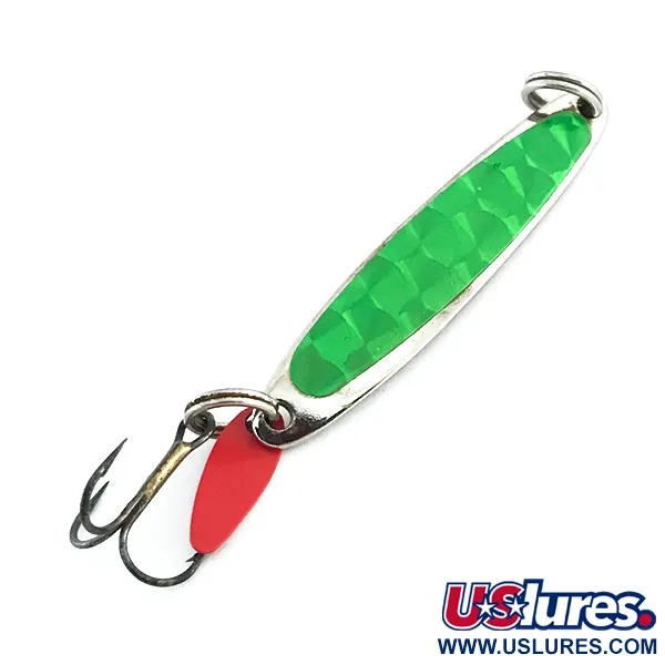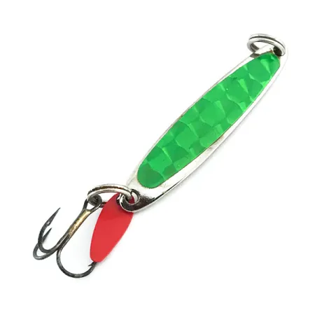 Il peso di 3/16oz (6g) rende questo esemplare ideale per raggiungere rapidamente la profondità durante il jigging verticale a sandre o persici. Questo Bay de Noc Swedish Pimple, registrato con il codice prodotto 9016, presenta un corpo compatto da 1 3/4" (4,5cm) con finitura in nichel lucido. Un lato è impreziosito da un nastro prismatico sfaccettato verde vibrante che offre un riverbero distinto sott'acqua. Una caratteristica fondamentale di questo modello è la piccola paletta flicker in plastica rossa fissata vicino all'ancoretta, pensata per fungere da punto di attacco visivo per il pesce. In base all'aspetto, l'esca è in condizioni 5/5, senza segni di utilizzo sulle superfici metalliche o sull'inserto prismatico. La componentistica, inclusi gli anelli spaccati e l'ancoretta, è lucida e priva di usura.