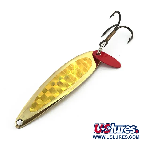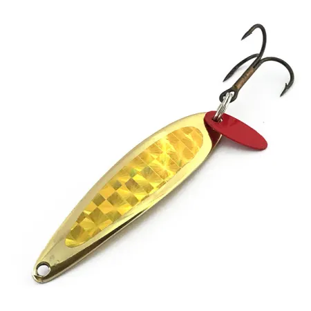 Un peso consistente di 14 g (1/2 oz) distribuito su una lunghezza di 5,5 cm (2 1/4") consente a questo jig verticale di scendere rapidamente verso la strike zone. Questo Bay de Noc Swedish Pimple, codice prodotto 9053, vanta una finitura dorata ad alta lucentezza arricchita da un nastro olografico a scacchi gialli che garantisce riflessi multidirezionali. All'estremità, un robusto amo triplo è montato insieme a una piccola paletta in plastica rossa, che funge da richiamo visivo contro il corpo dorato. Prodotta negli Stati Uniti, questa esca rappresenta una tradizione di design amata da generazioni di pescatori nel ghiaccio e in acque libere che insidiano lucioperca e trote in profondità. La componentistica e la placcatura in oro sono in ottime condizioni, con una valutazione di 5/5. Un occhiello pulito si trova all'estremità affusolata, mentre il lato opposto mostra la superficie dorata liscia e riflettente tipica di questi classici del Michigan.