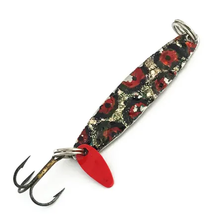 Il nickel martellato costituisce la base di questa esca da jigging verticale da 4,5 cm. Il lato anteriore presenta un accattivante motivo dipinto a mano con punti rossi e neri su una base glitterata dorata, in condizioni eccellenti 5/5. Con un peso di 6 g, questo esemplare riporta il codice prodotto 9084 e mette in mostra la classica maestria artigianale di Bay de Noc di Gladstone, Michigan. Una caratteristica paletta in plastica rossa è fissata all'anello elastico inferiore insieme a un affilato amo triplo, progettato per fornire un bersaglio ad alta visibilità per i pesci in acque profonde. Il retro espone la finitura in metallo martellato profondamente strutturata, destinata a catturare e riflettere la luce da varie angolazioni. Utilizzata sia per il lancio in acque libere che per la pesca verticale sul ghiaccio, la forma sottile e pesante per le sue dimensioni riflette oltre cinquant'anni di evoluzione del design influenzata dalle attrezzature tradizionali scandinave.