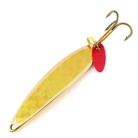 Il metallo con finitura dorata abbinato a una decalcomania prismatica gialla rende questo ondulante da 14g (1/2oz) un elemento di spicco in ogni cassetta da pesca. Con una lunghezza di 5,5 cm (2 1/4"), questo Bay de Noc Swedish Pimple presenta l'iconico profilo sottile che è stato un punto fermo della pesca americana per oltre mezzo secolo. Una paletta in plastica rossa traslucida è fissata all'anello elastico vicino all'ancoretta, fornendo un punto di attacco ad alta visibilità. Questo specifico esemplare, contrassegnato dal codice prodotto 9567, non mostra segni di utilizzo, garantendo una valutazione delle condizioni di 5/5. Il design è fortemente influenzato dalle esche scandinave per il jigging verticale, ottimizzate dal produttore del Michigan per presentazioni in acque profonde sia nel ghiaccio che in acque libere. Ogni componente, dal corpo placcato in oro agli ami affilati con finitura in bronzo, rimane in condizioni eccellenti, preservando le caratteristiche di alta luminosità necessarie per attirare persici, lucioperca e trote.