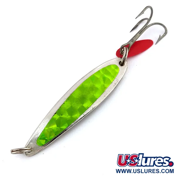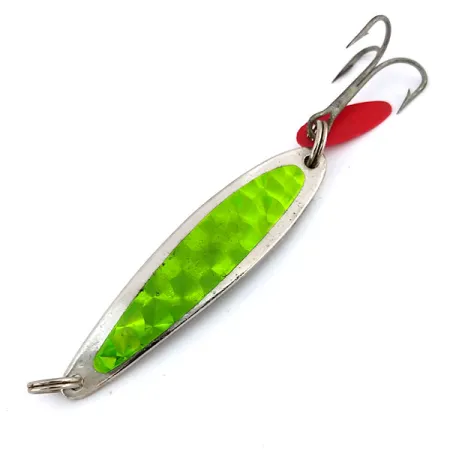 Con una lunghezza di esattamente 5,5 cm (2 1/4"), il profilo sottile di questa esca è progettato per una discesa diretta e un'elevata riflettenza. Il corpo nichelato è arricchito da un nastro verde a nido d'ape che emette un bagliore luminoso in condizioni di buio, fornendo un punto di riferimento visivo per i pesci in acque profonde. Questo esemplare, identificato dal codice prodotto 9856, presenta la classica paletta rossa Bay de Noc fissata all'anello spaccato posteriore insieme a un'ancoretta affilata. Con un peso di 14 g (1/2 oz), rappresenta una taglia standard per diversi predatori d'acqua dolce. Prodotta negli USA, l'esca è solida e affidabile per il jigging verticale o il lancio. Le condizioni di questa esca sono 5/5, con una finitura pulita e componenti ben mantenuti.