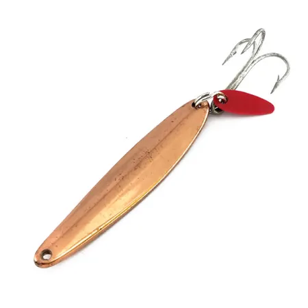 Rifinito in rame e con un peso di 1/4 oz (7 g), questo cucchiaino da jigging verticale rappresenta decenni di competenza di Bay de Noc nella produzione di esche specializzate. Il suo profilo sottile da 2 pollici (5 cm) permette al corpo di affondare rapidamente, una caratteristica di design originariamente perfezionata dai pescatori scandinavi per il jigging in acque profonde. Una pinna oscillante in plastica rosso brillante è montata sulla coda, fornendo un netto contrasto cromatico con la calda finitura metallica del corpo. Questo esemplare porta il codice prodotto 9903 e mantiene un alto livello di finitura su tutta la sua superficie curva, con una valutazione dello stato di 5/5. Il robusto amo triplo è fissato tramite un anello spaccato per impieghi gravosi, garantendo che la componentistica sia all'altezza della reputazione dell'esca per trote e walleye. La produzione di questi esemplari avviene negli USA, dove Bay de Noc continua a produrre questa silhouette specifica che è rimasta in gran parte invariata per generazioni.