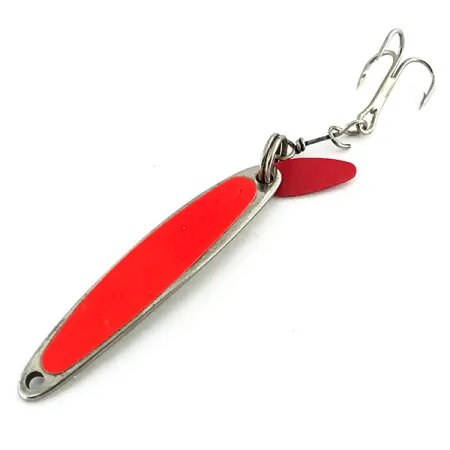 Un corpo nichelato abbinato a un inserto arancione vivace definisce questo specifico Bay de Noc Swedish Pimple. Con una lunghezza di 4,5 cm (1 3/4") e un peso di 6 g (3/16 oz), questo esemplare riporta il codice prodotto 9051 e rappresenta un classico del design statunitense. Il pannello arancione è progettato per un'alta visibilità, reagendo fortemente all'esposizione ai raggi UV per aiutare i pesci a individuare il profilo in acque profonde o in condizioni di scarsa illuminazione. La struttura consiste in una lama metallica sottile e leggermente curva, dotata di un anello spaccato e di un'ancoretta affilata. Una piccola paletta in plastica rossa è fissata all'armatura, agendo come punto focale visivo secondario vicino all'amo durante il vertical jigging o il lancio. Questo artificiale è in condizioni 5/5, con le superfici riflettenti e la componentistica che non mostrano segni di utilizzo.