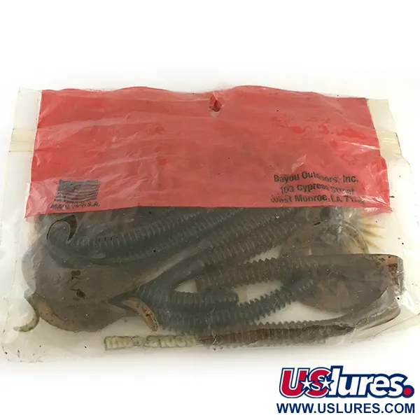 Gli anelli fortemente strutturati lungo il corpo da 4" (10 cm) di queste esche siliconiche sono l'elemento distintivo della serie V&M "Ultimate Bassin' Bait" di Bayou Outdoors. Questo lotto specifico, identificato dal codice prodotto 6669, include 11 pezzi di gomma morbida di produzione americana nel classico colore Green Pumpkin. Impregnate con un profilo aromatico che esalta la tecnica del marchio "pork fat cooked in", queste esche mantengono la loro originaria morbidezza. Il design con coda a falce (curly tail) attaccata al torso a coste fornisce un contrasto visivo ai glitter scuri inclusi nella plastica verde traslucida. Sebbene la busta originale sia aperta e mostri segni di conservazione, le esche sono in condizioni inutilizzate.
