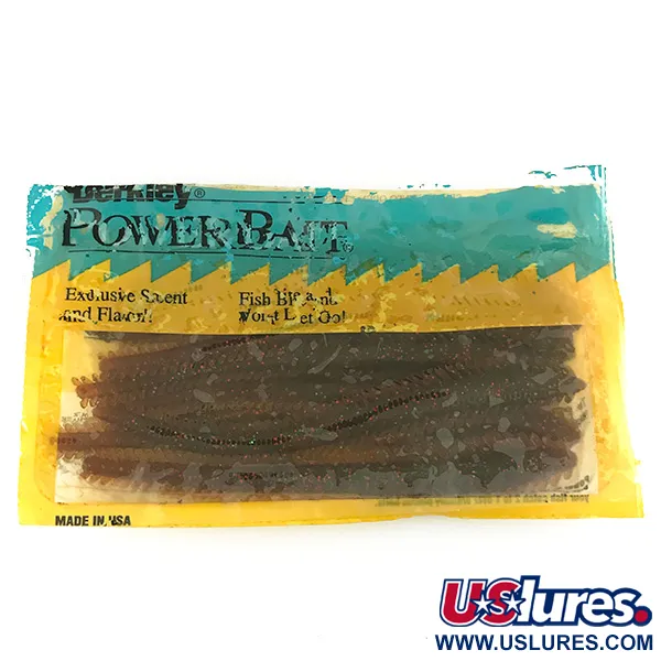Con una lunghezza di esattamente 15 cm (6"), queste esche siliconiche rappresentano un'era cruciale nella tecnologia dei artificiali aromatizzati. Questa confezione specifica, dal peso di 17,3 g (0,61 oz), è disponibile nella colorazione Red, un rosso-brunastro scuro traslucido saturo di finissimi glitter rossi. Questo set da 8 pezzi, identificato dal codice 7097, è nuovo nella sua confezione originale vintage gialla e blu. Il design è caratterizzato da un corpo fortemente anellato che si assottiglia in una coda sottile, una struttura ottimizzata per il jigging e le presentazioni a contatto con il fondo. Prodotta negli USA, la confezione include sul retro l'iconico grafico delle prestazioni Berkley, che sottolinea l'approccio scientifico alla formula PowerBait. La consistenza morbida e la fitta anellatura sono tipiche della qualità mantenuta da Berkley in questo periodo di produzione.
