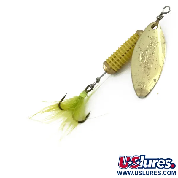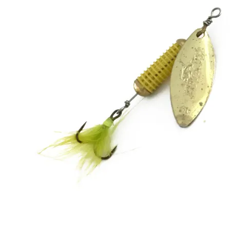 Una vivace palletta a foglia di salice tonalità oro domina il profilo di questo rotante Berkley Scent Vent. Con una lunghezza di 6 cm (2 1/4"), il componente centrale è un distintivo corpo in plastica rigata gialla, specificamente progettato per trattenere e rilasciare l'attrattore durante l'uso. Questo particolare esemplare, identificato dal codice prodotto 9437, è in condizioni 5/5, mostrando finiture metalliche ben conservate e un manicotto di diffusione dell'essenza pulito e intatto. La componentistica presenta un'ancoretta piumata con piume giallo brillante e marabù, che fornisce un elemento visivo morbido dietro il corpo zavorrato. Con un peso di 4,5 g (3/16 oz), la costruzione dell'esca include un robusto asse in metallo e un classico occhiello superiore per un facile fissaggio del filo. Prodotta negli USA, la palletta placcata in oro è stampata con il logo del marchio Berkley, un segno distintivo per i collezionisti di attrezzatura terminale vintage di metà secolo.
