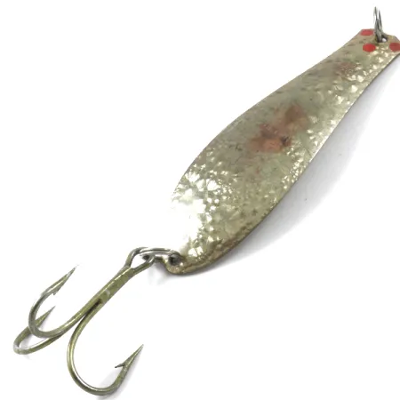 Con un peso di 1 oz (30 g), questo ondulante presenta la rara finitura 'Crystal', una trama martellata progettata per imitare il luccichio del vetro rotto sotto la superficie. Il Prescott Spinner Big Doctor 285, identificato dal codice prodotto 3173, è lungo 4 1/4" (11 cm) e mantiene il suo classico profilo di produzione americana. Piccoli punti rossi sono posizionati vicino all'occhiello, aggiungendo un sottile tocco di colore al corpo metallico strutturato. Questo pezzo vintage è in condizioni 4/5, riflettendo una storia ben conservata con una leggera usura superficiale dovuta all'età. L'attrezzatura originale, inclusi l'ancoretta e gli anelli spaccati, rimane intatta e sicura per il casting o la traina.