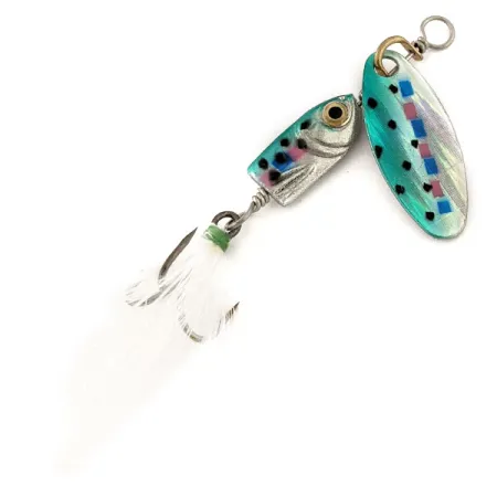 Con un peso di 1/8 oz (4g), questo rotante compatto dimostra la meticolosa cura che Blue Fox ha dedicato alla sua serie Deep Runner. La colorazione Rainbow Trout è applicata sapientemente sia sulla pala a goccia che sul corpo realistico a forma di pesce, con una combinazione di tonalità verde acqua, argento e rosa con tipiche macchie scure. Lungo 2" (5 cm), l'esca è costruita su una robusta armatura in acciaio tipica della produzione americana di quell'epoca. Questo esemplare, identificato dal codice prodotto 12799, è in condizioni 5/5, con vernice e superfici galvanizzate prive di segni di usura. Una caratteristica distintiva è l'amo tripletta piumato in coda; la piuma bianca è legata con precisione con un filo verde per offrire un profilo sinuoso in acqua. Progettato come Deep Runner, il corpo zavorrato permette all'esca di mantenere la profondità durante un recupero regolare. L'occhio dorato sul corpo stampato e la girella di alta qualità in testa riflettono l'impegno del marchio per una componentistica funzionale e di alta qualità.