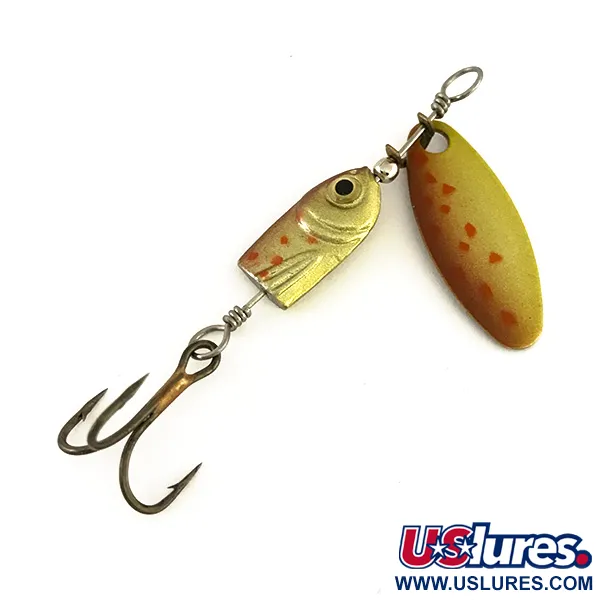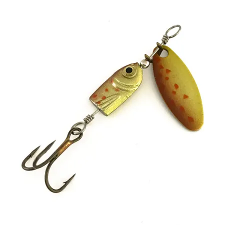 Punzonato con il marchio di origine "Finland" sul retro della sua palletta argentata, questo cucchiaino rotante rappresenta un'epoca classica della produzione europea di esche. Questo esemplare da 5 cm, catalogato con il codice 7889, presenta un corpo appesantito a forma di testa di pesce da 4 g. La livrea Trota Fario è applicata meticolosamente sul corpo in piombo e sulla faccia della palletta ovale, composta da una base dorata calda con punti arancioni brillanti e un occhio scuro ben definito. Un amo triplo affilato è fissato all'armatura passante, rifinita con avvolgimenti stretti e piccole perline distanziatrici metalliche. Le condizioni sono valutate 5/5, con una vernice ben conservata sul corpo dal profilo a pesciolino e superfici metalliche pulite e riflettenti.