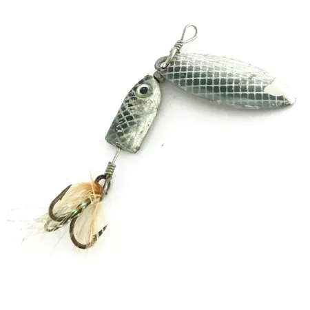 Con un peso di 5g, questo rotante prodotto in Finlandia mette in mostra l'artigianato di qualità tipico della tradizione finlandese del marchio. La finitura Rainbow Silver del Blue Fox Flash Deep Runner presenta un motivo a scaglie a griglia sia sulla paletta a goccia che sulla testa piombata a forma di pesciolino, distinguendolo dalle esche lisce standard. Lungo 5,5cm, questo esemplare ha il codice prodotto 8318 e si presenta in condizioni 4/5, mantenendo la lucentezza delle parti metalliche. Il design utilizza un'ancoretta piumata con piume naturali, fornendo un profilo morbido dietro il corpo in piombo. I collezionisti apprezzeranno l'allineamento della paletta e del corpo zavorrato, una configurazione tecnica progettata per raggiungere profondità specifiche durante il recupero. La placcatura in argento rimane brillante, specialmente nei dettagli testurizzati delle scaglie che definiscono questa specifica variante di colore.