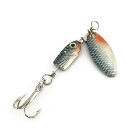 Motivi a squame azzurro decorano sia la pala che il corpo di questo cucchiaino rotante da 4 g (1/8 oz), mettendo in risalto il suo classico design finlandese. Il Blue Fox Flash Deep Runner, codice prodotto 8967, presenta un profilo da 5 cm (2") costruito attorno a un corpo zavorrato a forma di piccolo pesce esca. Questo corpo include un occhio dipinto realistico e un'area della testa tinta di arancione che si abbina al dettaglio sulla punta della pala a foglia di salice. Mentre la parte anteriore della pala mostra l'intricato motivo a squame blu e argento, il retro è rifinito in argento lucido. Un cavallotto color ottone permette alla pala di ruotare liberamente attorno al telaio in filo d'argento, collegato a un'ancorina tramite un anellino spaccato. Le condizioni sono valutate 5/5, poiché l'esemplare è eccezionalmente pulito con una verniciatura vibrante e componenti metalliche lucenti. Una fine zigrinatura sulle superfici metalliche aggiunge uno strato di complessità visiva all'esca.