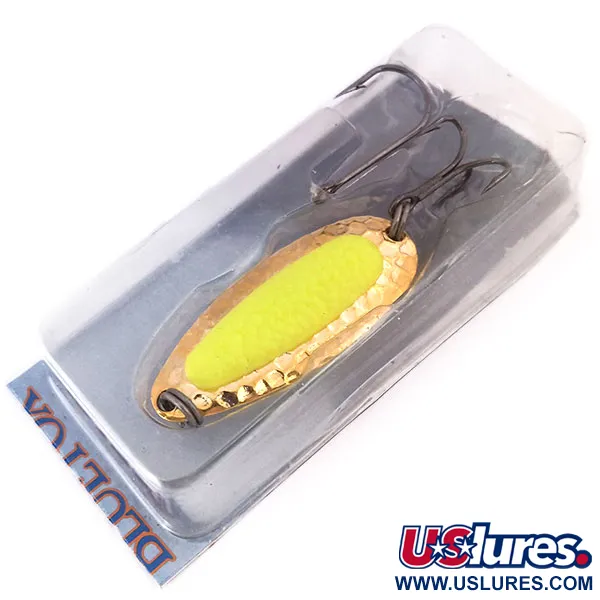 Con un peso di 1/2oz (14g), questo modello presenta un corpo in ottone pesante rifinito con una vera placcatura in oro 24 carati. Lungo 5,5cm, il design include un inserto giallo brillante che simula un uovo di salmone, fungendo da bersaglio per gli attacchi. Identificato dal codice prodotto 10285, il Blue Fox Pixee UV è in condizioni pari al nuovo, conservato nella sua confezione originale. L'esca è appesantita per lanci a lunga distanza e per la stabilità nelle correnti fluviali, dove può rotolare e oscillare vicino al fondo. Sotto la luce UV o al buio, l'inserto emette una forte luce verde, offrendo un'alta visibilità in acque profonde o torbide. Questo esemplare è valutato 5/5, non mostrando segni di usura sulla placcatura in oro.
